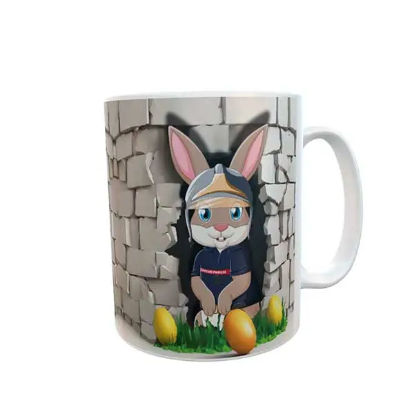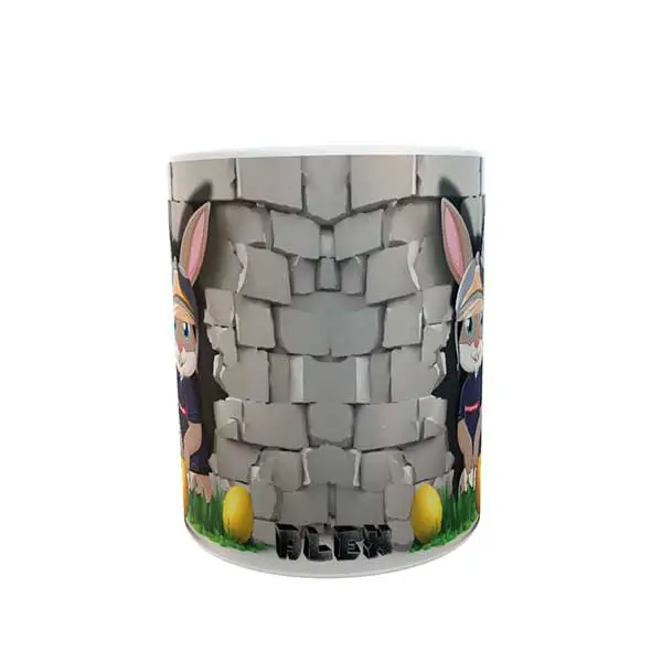 Découvrez ce mug avec Pompélo, notre lapin de Pompiers prêt pour Pâques. En effet, Pompelo trop pressé de trouver les oeufs en chocolat, a préféré traverser le mur que de sortir par la porte ! Une tasse pour les soldats du feu qui ont gardé leur âme d’enfant.