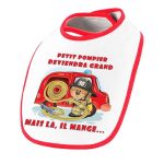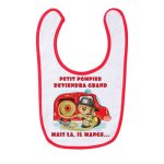 Bavoir bordure rouge au graphisme tout doux pour nos petits pompiers.